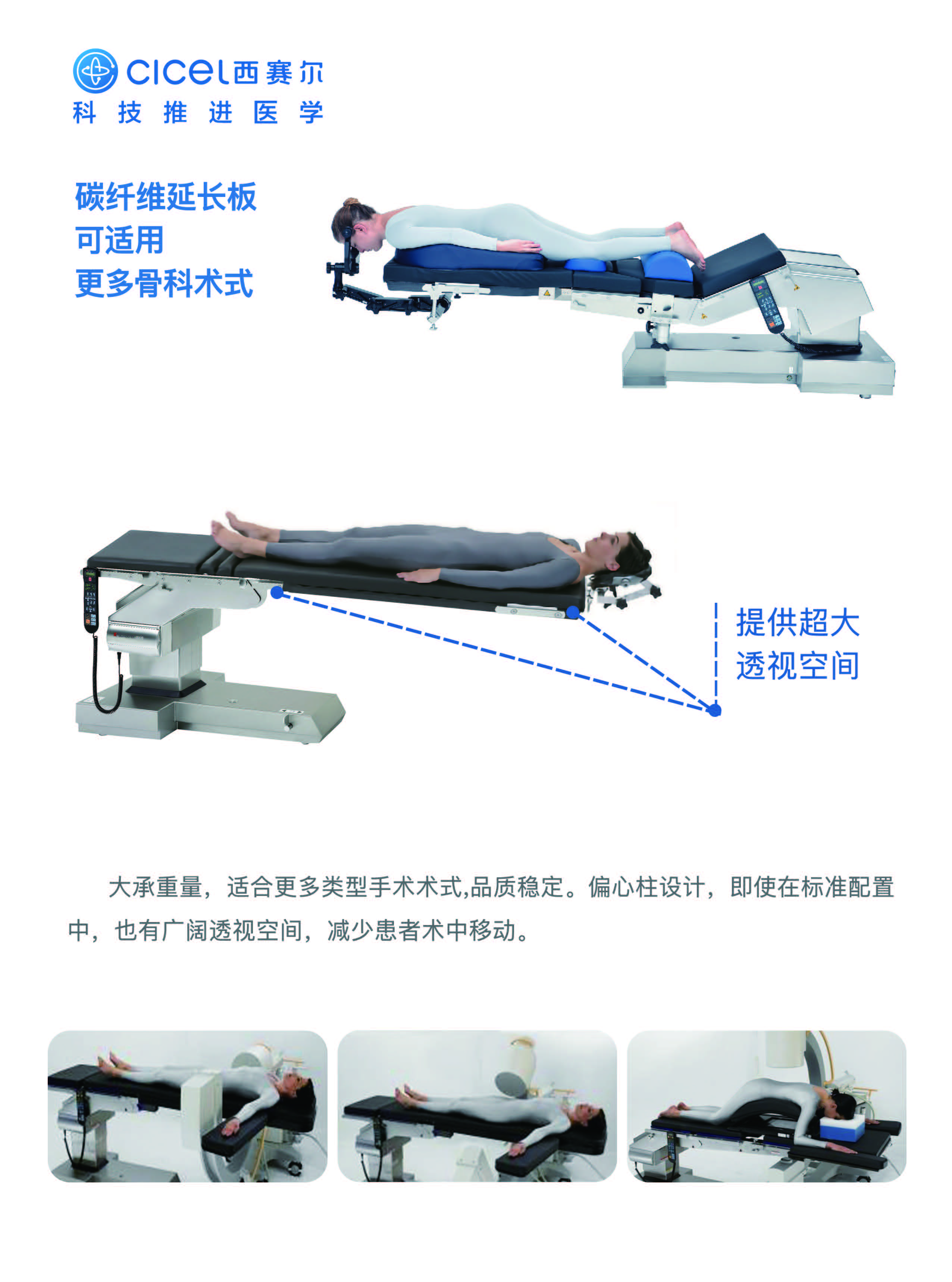此外,该手术床为多功能手术床,可增配各类手术配件,例如碳纤维脊柱框架、全悬空下肢牵引架、140cm碳纤维板、神经外科头架、妇科用截石位腿架、腔镜用马镫型腿靴等相关配件后,满足骨科、妇科、普外科、腔镜、眼科等手术需求。