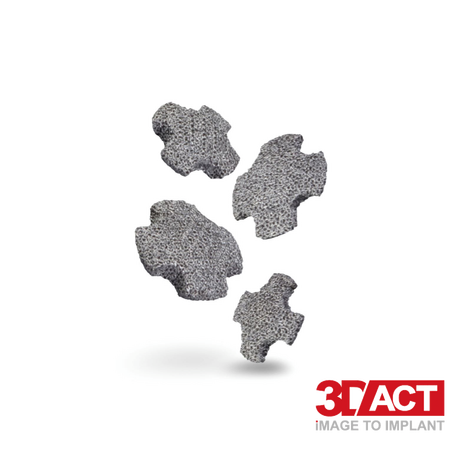 3D ACT髋臼垫片(Disk Augment)”四叶草”型设计,有不同的直径和厚度。整体为高孔隙率多孔结构。3D ACT髋臼垫片主要用于髋臼内壁骨缺损的封闭和重建,可以为髋臼杯提供内侧支撑。