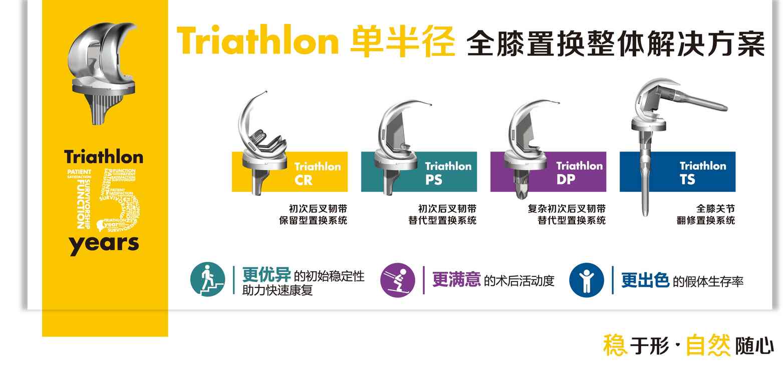 Triathlon 单半径置换整体解决方案是史赛克基于Triathlon单半径全膝关节系统,以膝关节单一半径运动理论为指导提供的一整套膝关节置换手术的整体解决方案,包括从初次膝关节置换的CR,CS,PS到复杂初次手术的DP方案和翻修手术的Triathlon TS翻修置换系统,各产品采用相同的设计理念,具有很好的兼容性和灵活性。自2004年上市以来,经超过15年的临床验证,Triathlon膝关节全球植入量超过300万例。 Triathlon 膝关节系统遵循软组织引导膝关节运动的设计思路,旨在为患者提供一款同时兼顾早期康复、术后稳定性和活动度及长期有效性的假体。
